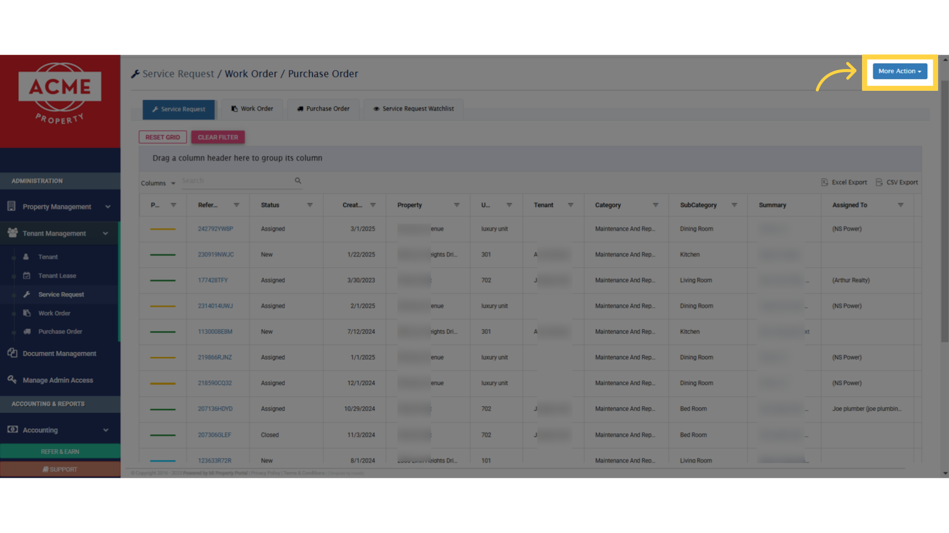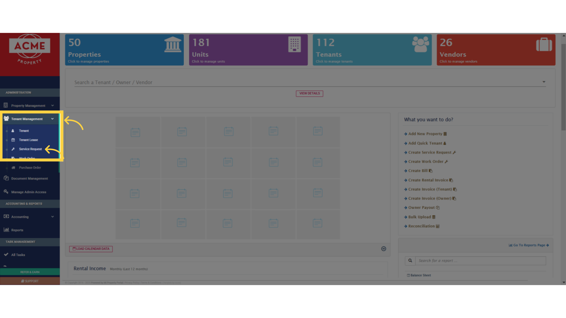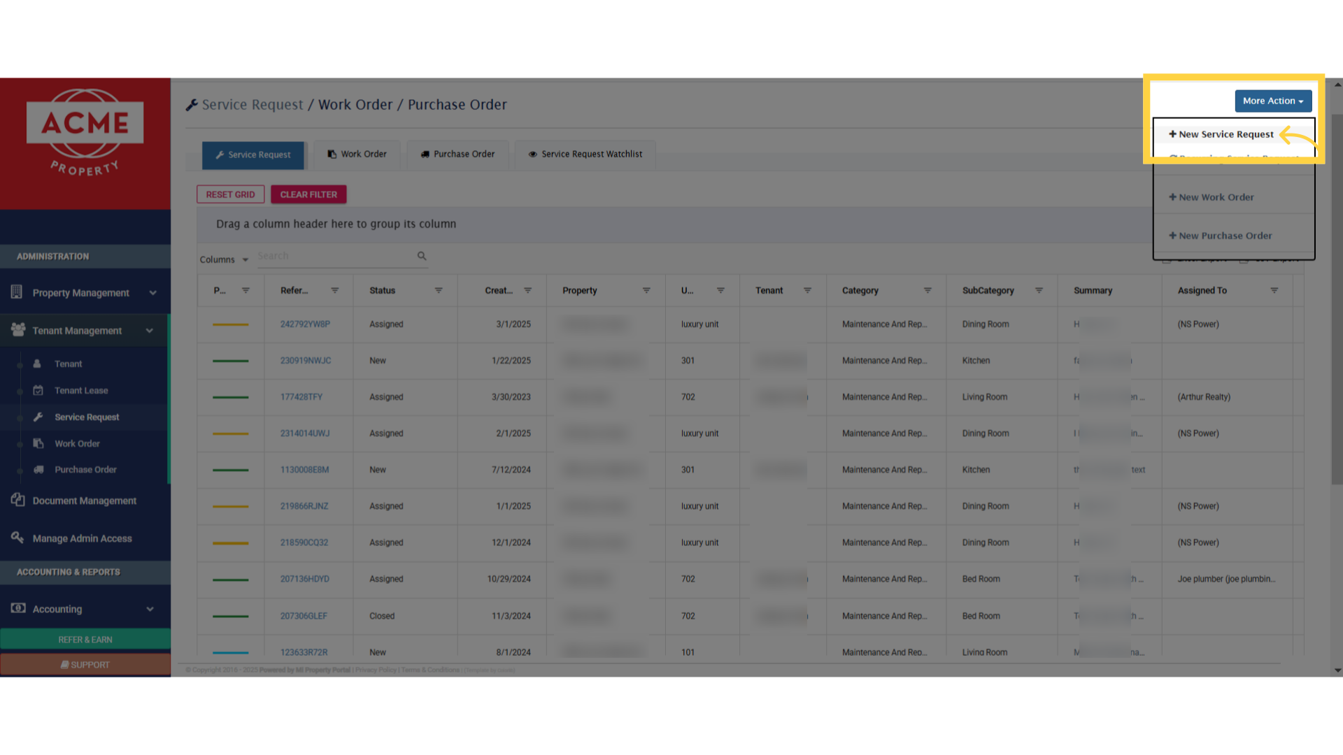 1. Within the “Tenant Management” dropdown, Click Service Request to go to the Service Request list