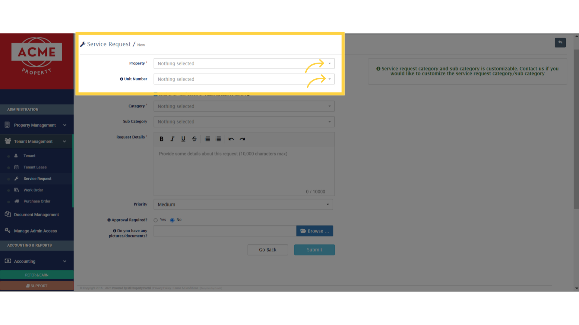 4. Okay, now the part to fill out the Service Request form. First select a property and then a unit from the respective dropdowns