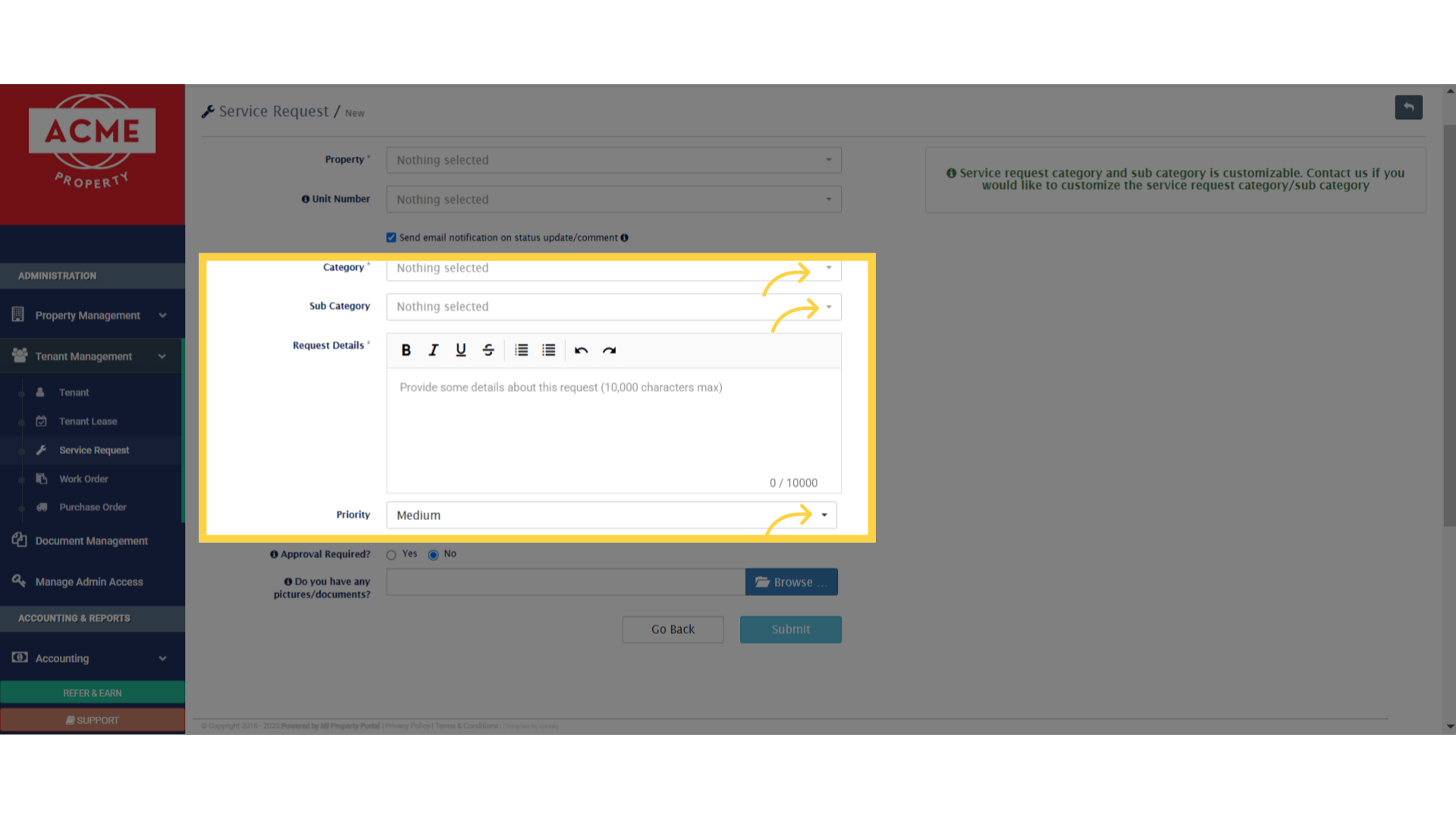 6. Choose a category and sub-category from the respective dropdowns. Put the description in the Request Details box, and set priority from the dropdown