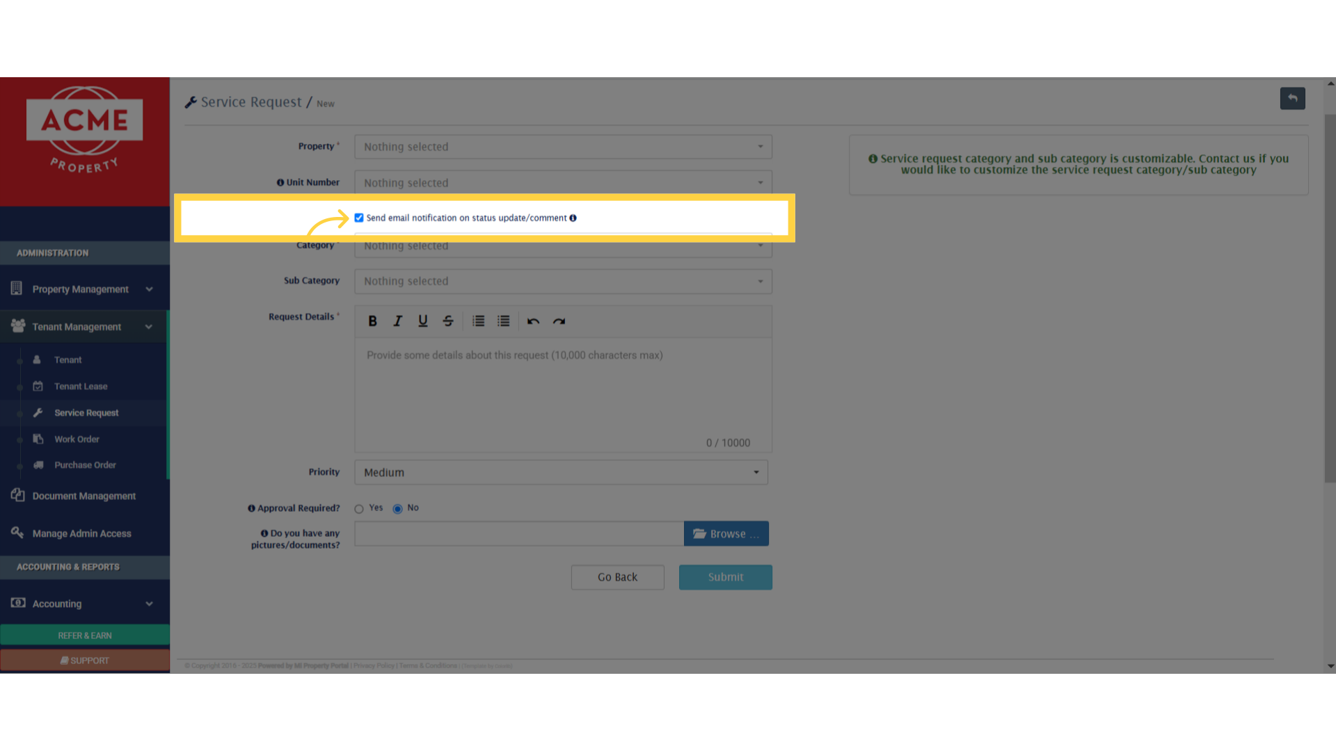 5. Tick the “Send email notification on status update/comment” box to ensure the tenant receives an email notification about any changes or comments