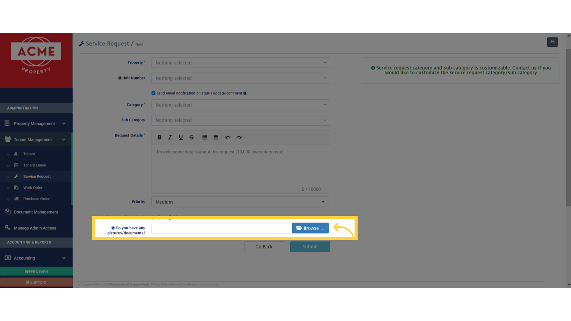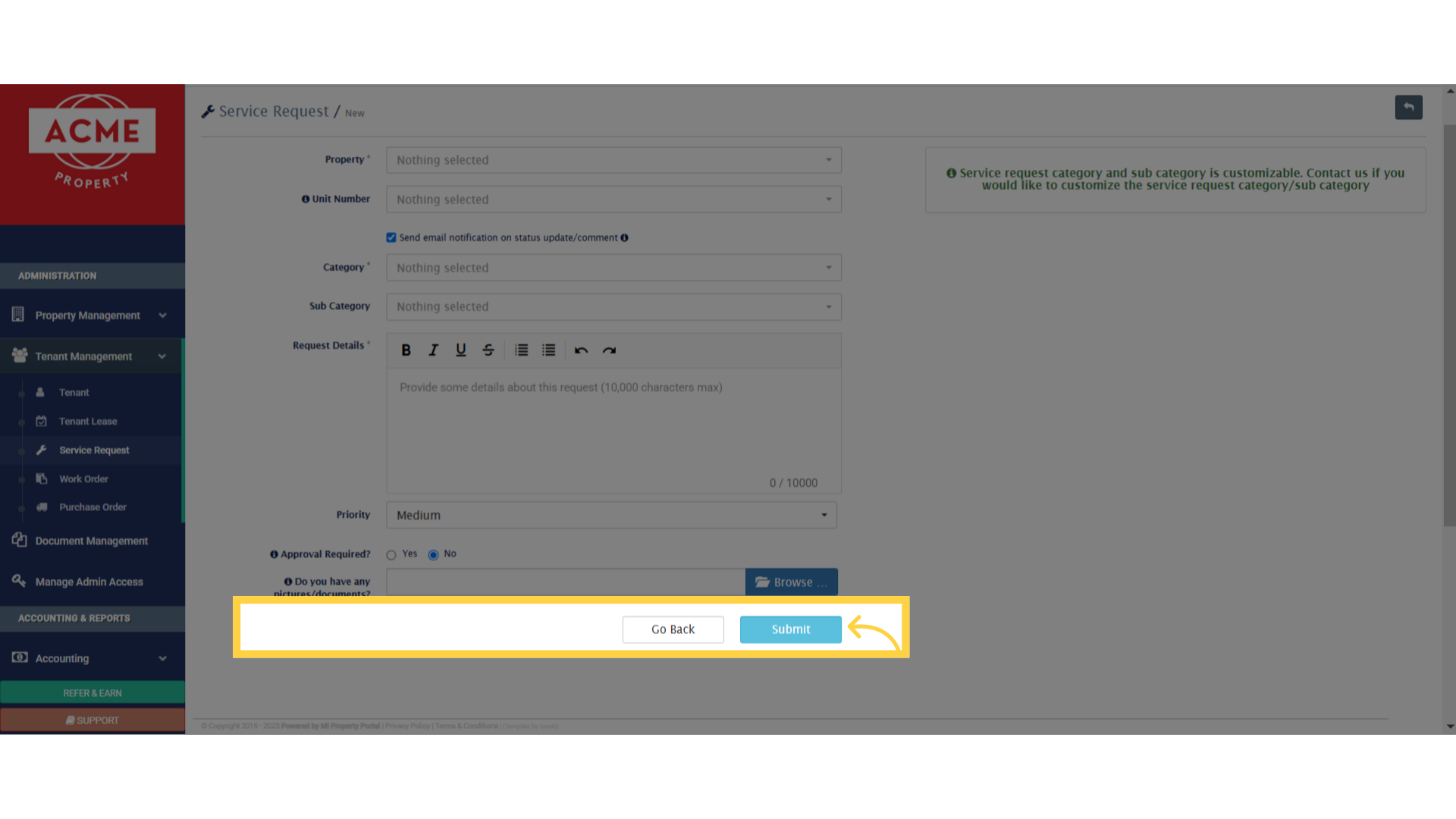 9. Once you’ve entered all the details and added any attachments, click on Submit to create the service request