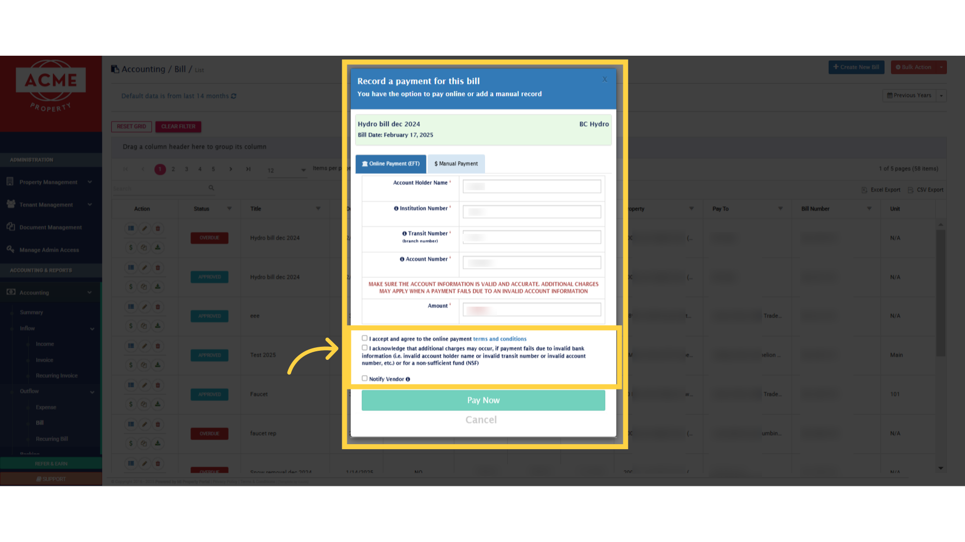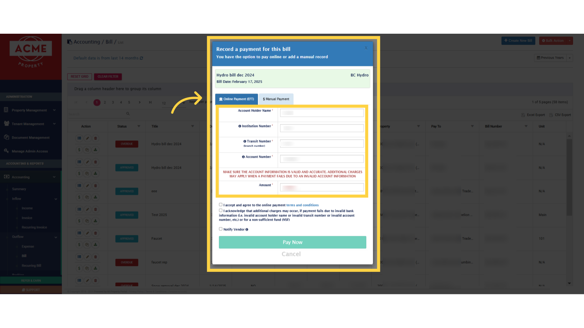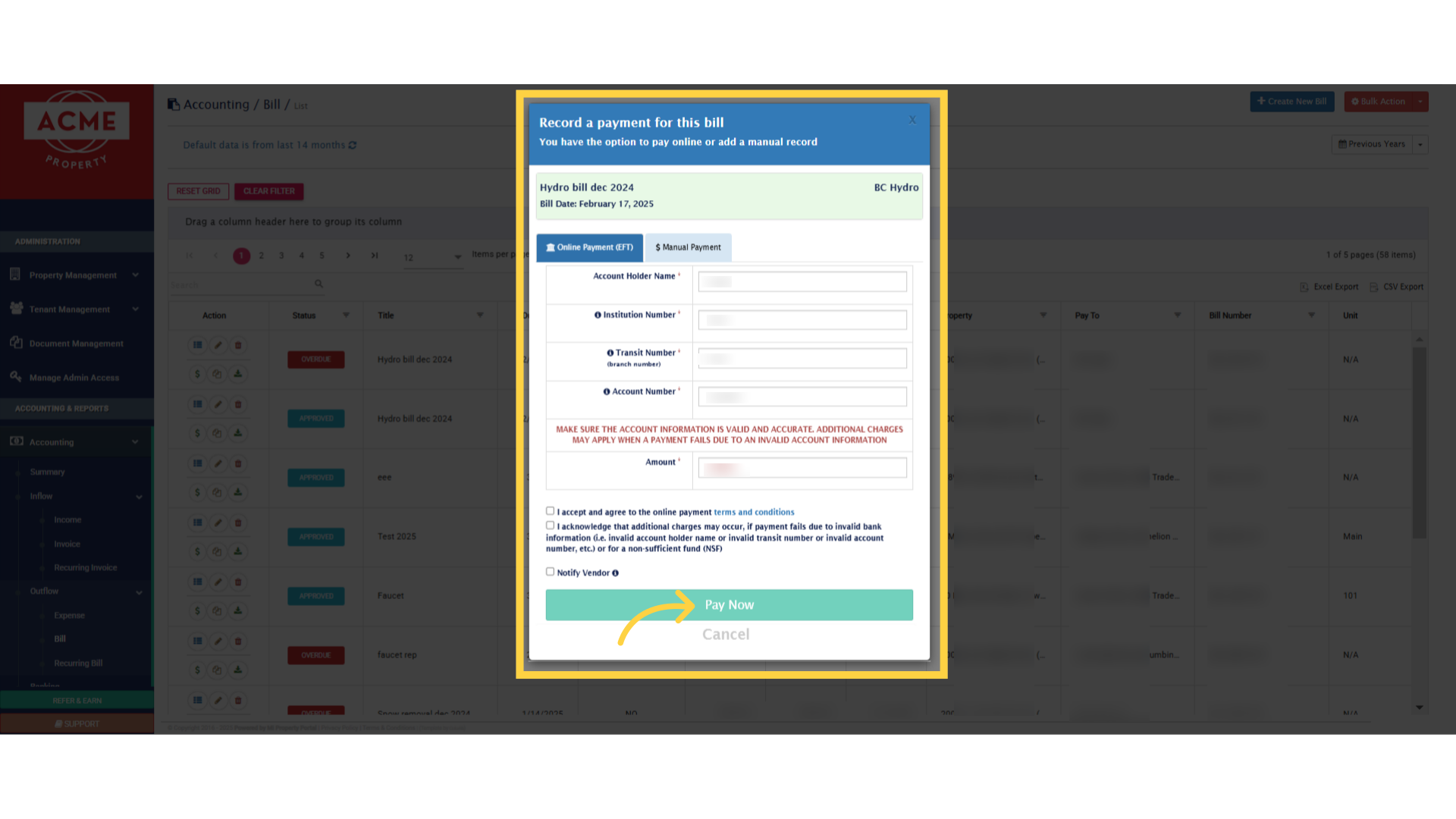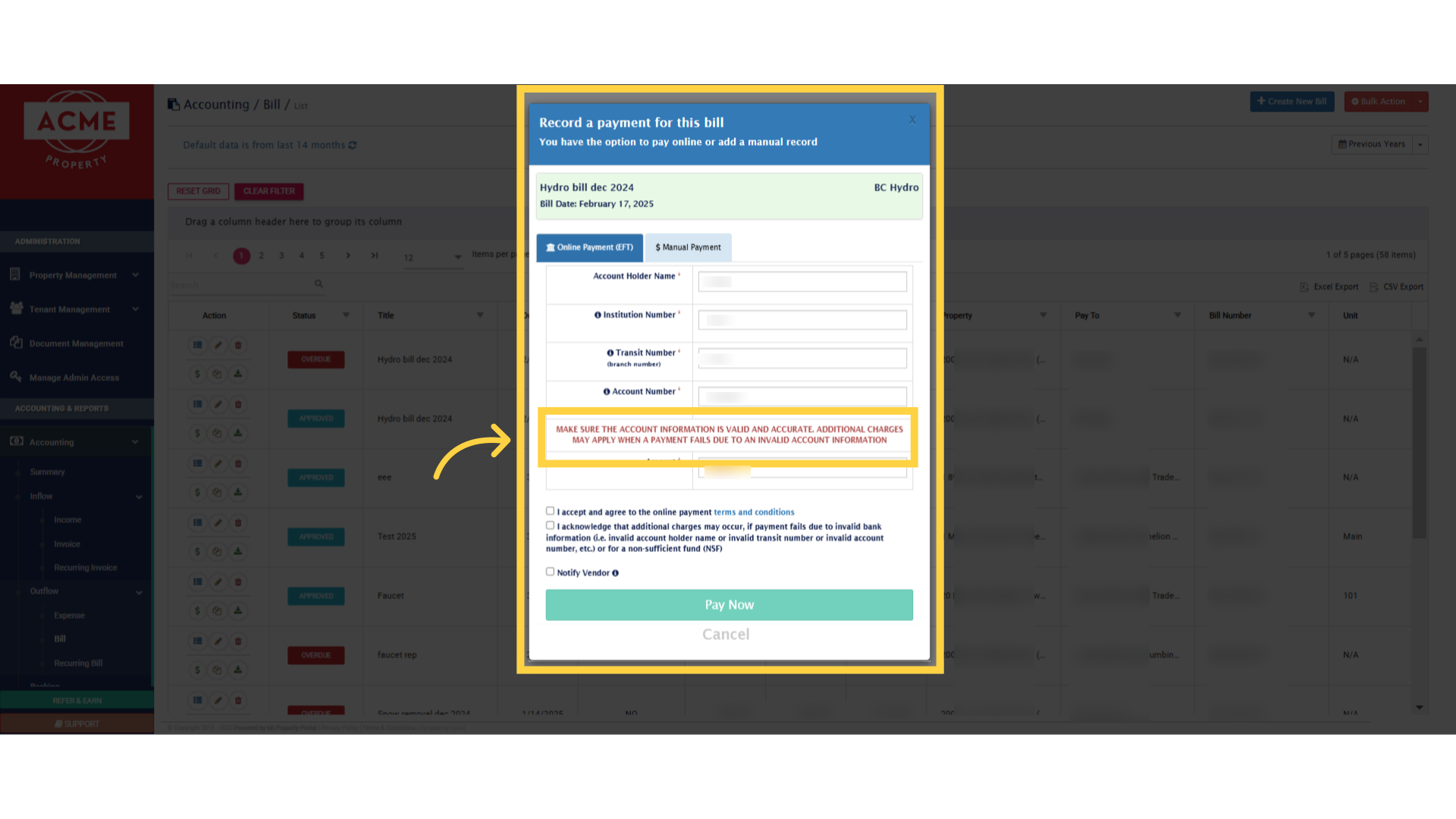 6. Go through this note here, which explains that It’s important to double-check the account information, before proceeding. If any details, like the account number or transit number, are incorrect, the payment could fail, and additional charges may apply