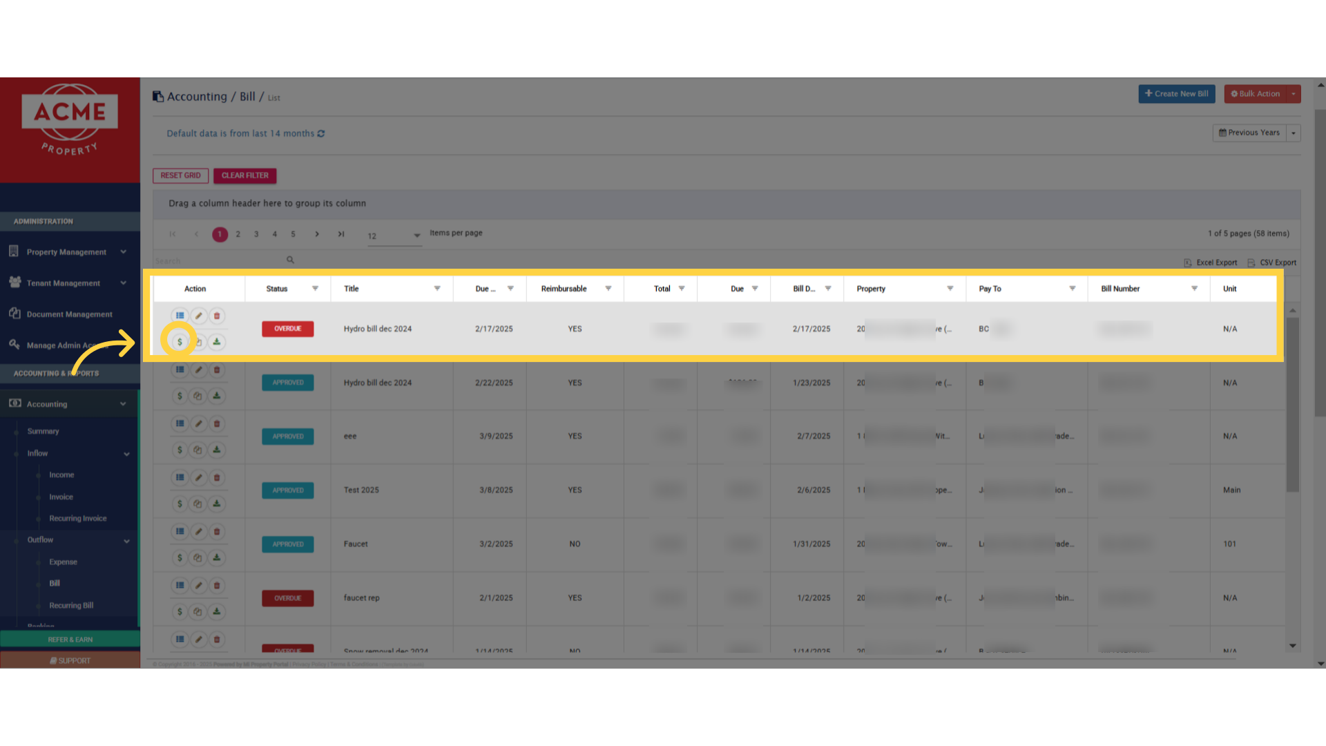 3. Now that we’re on the Bill List View page, let’s focus on the highlighted bill below. To record a payment, simply click on the dollar icon next to the specific bill