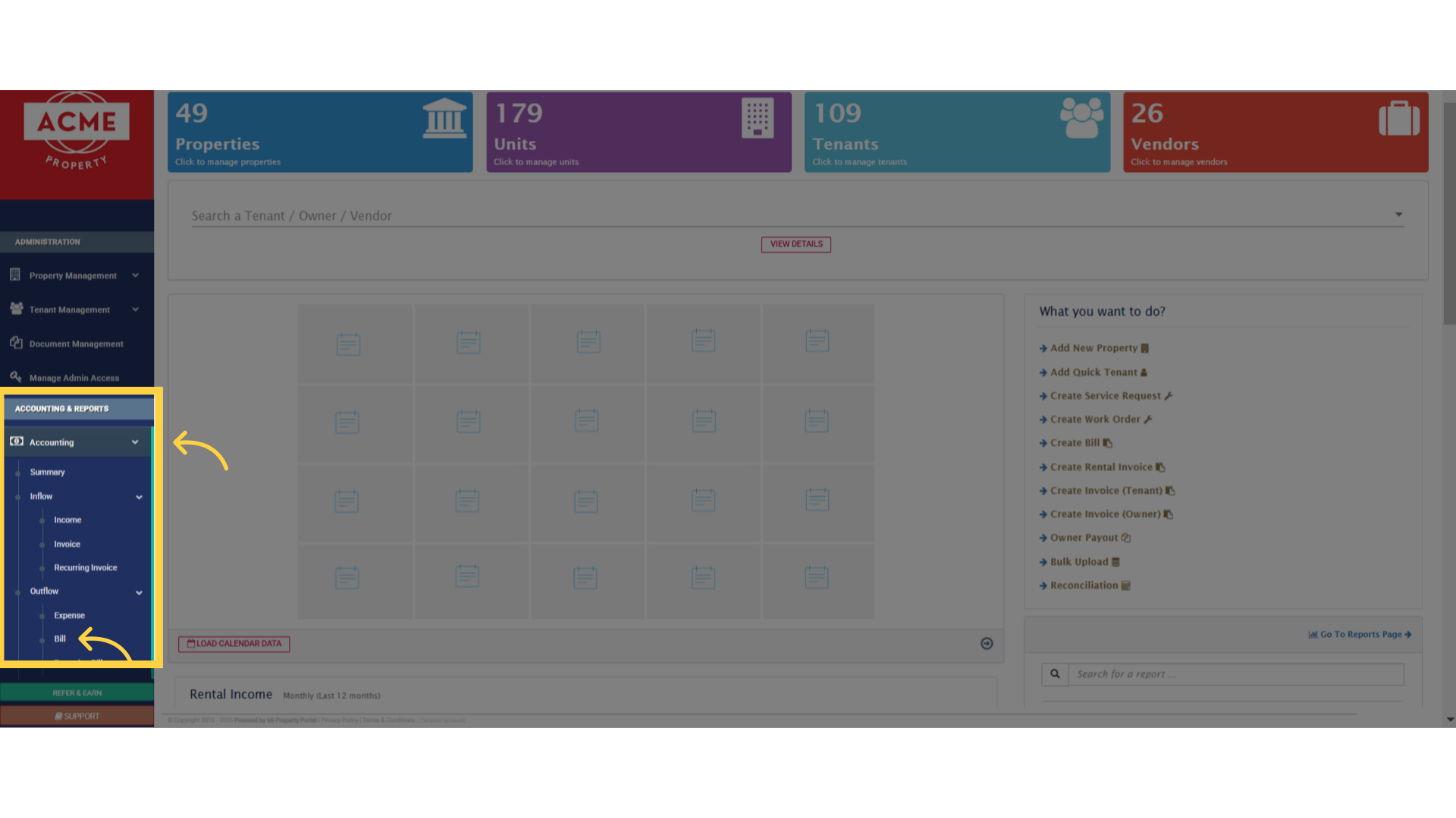 2. First step, from the left navigation menu, go to the Accounting & Reports section, click on the Accounting dropdown, and then select Bill to access the list of all created bills