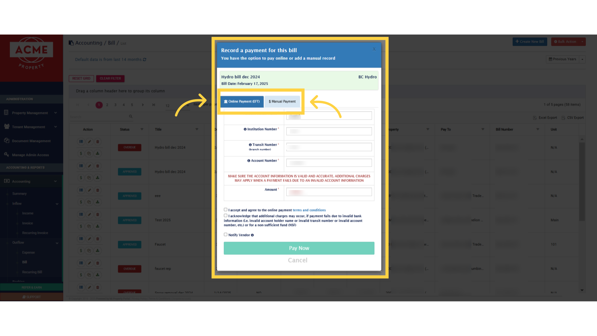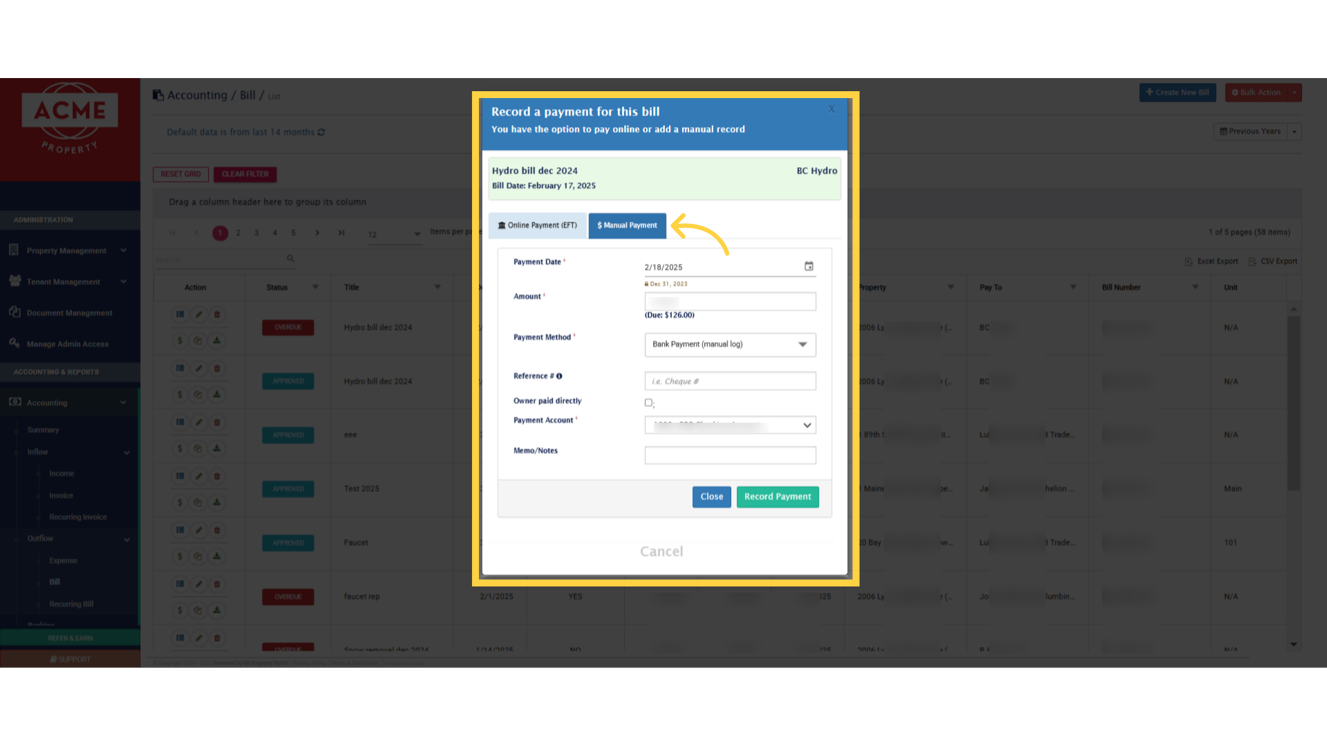 9. You can also record a manual payment by switching to the Manual Payment tab first. This allows you to log payments made outside the portal, such as cash or cheque, or so on