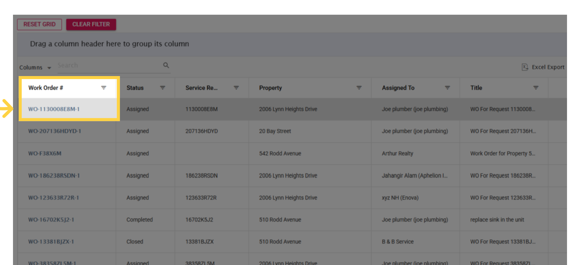 2. Locate a work order to update. Click on the work order unique code to open it