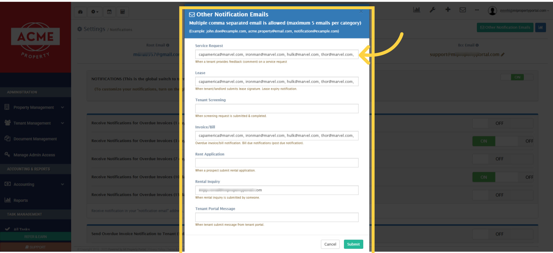 16. For example, if you want service request notifications to go to multiple people, you can enter their email addresses in the corresponding box.